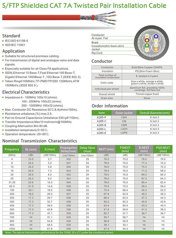S/FTP Shielded CAT 7A Twisted Pair Installation Cable
