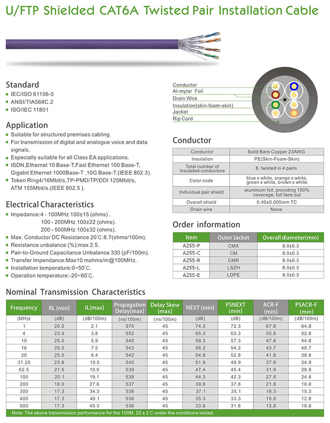 U/FTP Shielded CAT 6A Twisted Pair Installation Cable