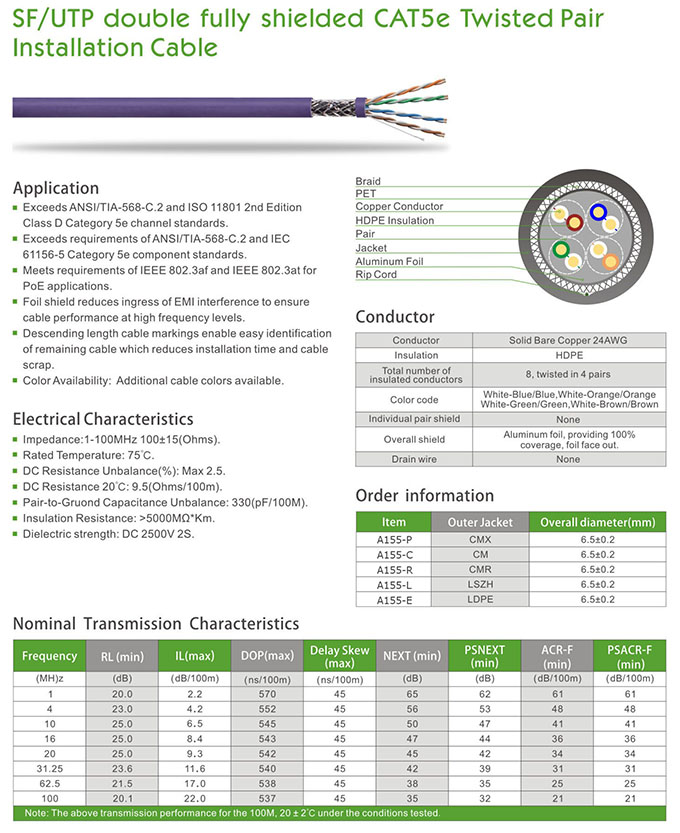 SF/UTP double fully Shielded CAT 5e Twisted Pair Installation Cable