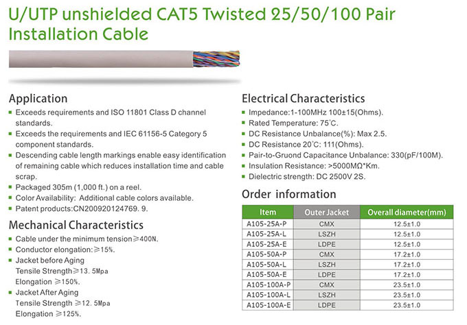 U/UTP Unshielded CAT 5 Twisted 25/50/100 Pair Installation Cable