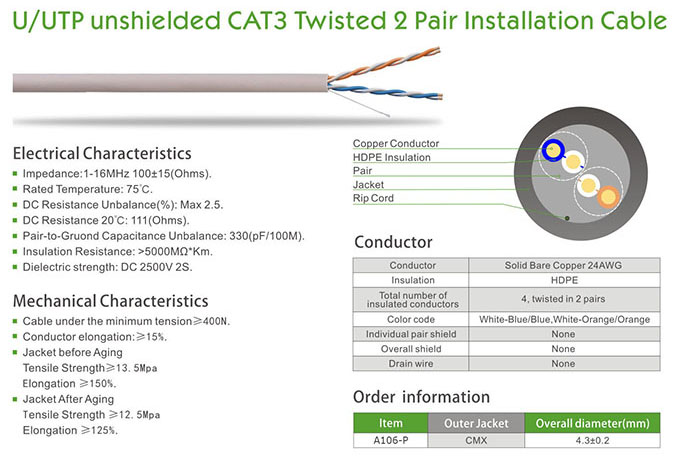 U/UTP Unshielded CAT 3 Twisted 2 Pair Installation Cable